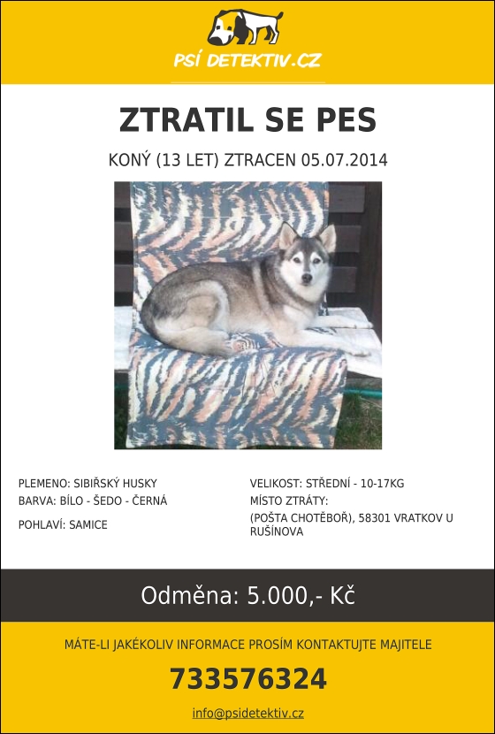 Krouna - 5.7.2014 ve 14.hod. v oblasti Vratkov u Rušínova se nám ztratila v okolí Chotěboře fenka Koný. 13 let stará, plemeno Sibiřský husky, barva Bílo - Šedo - Černá. Je přátelská, hodná a není agresivní. Může být na cestě do Poděbrad. Finanční odměna nálezci jistá. Vyběhla z pozemku. Povahově společenská, na pamlsek půjde. Obojek nemá. Čipovaná není, tetovaná také není. Nikdy neutekla. Kastrovaná je. Okolí z místa ztráty relativně zná. Má ráda pohyb, je aktivní. Je tedy podezření, že je již hodně daleko! Vodu miluje. Zdravotní stav dobrý, až na horší sluch. Je opravdu malá, vypadá jako štěně!