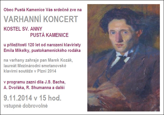 Pustá Kamenice - Obec Pustá Kamenice Vás srdečně zve v neděli 9. listopadu 2014 od 15.00 hodin u příležitosti 120 let od narození klavíristy Emila Mikelky, pustokamenického rodáka na Varhanní koncert do kostela Sv. Anny.
