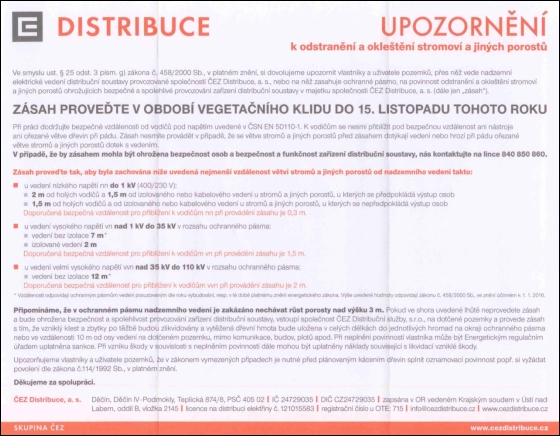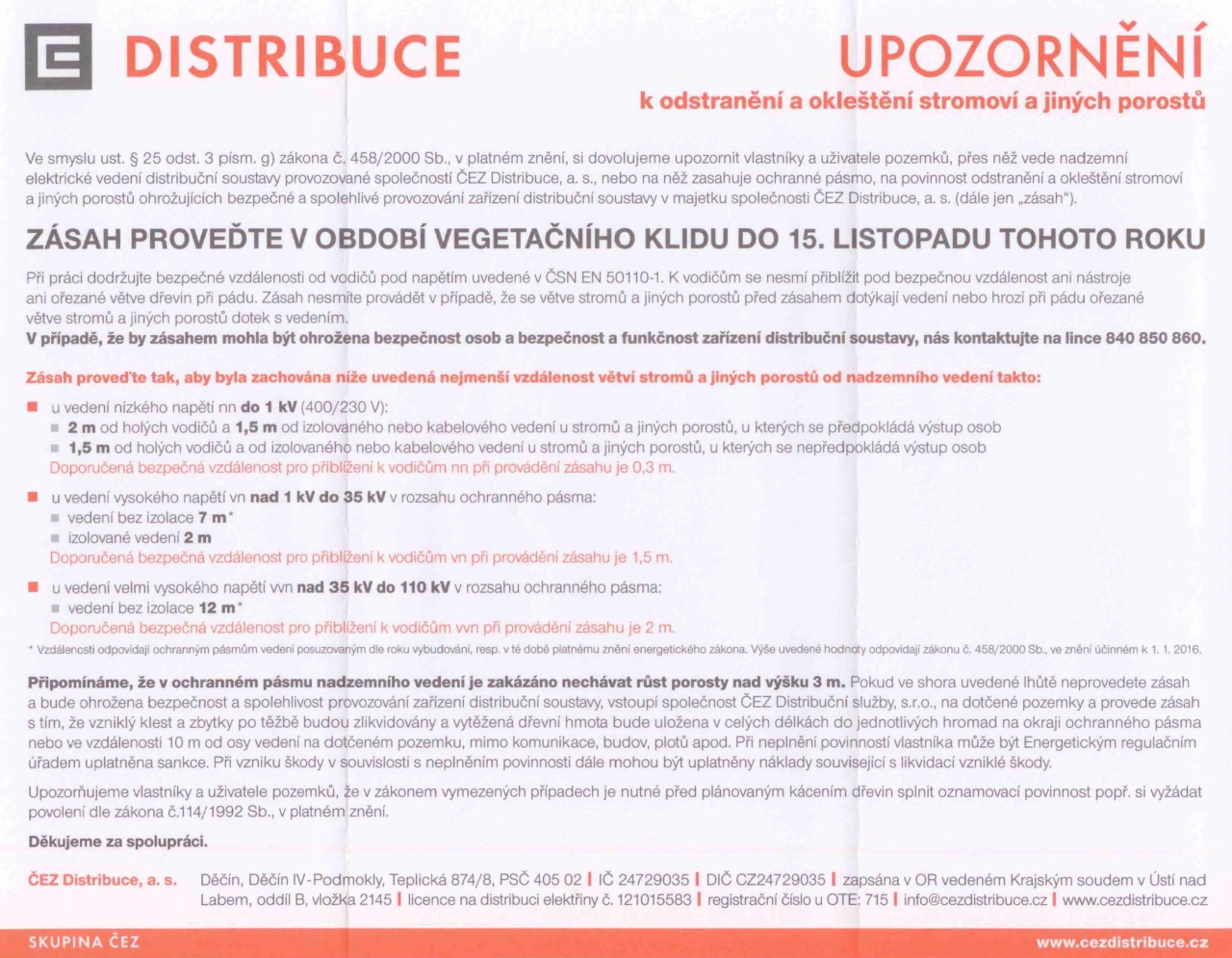 Připomínáme, že v ochranném pásmu nadzemního vedení je zakázáno nechávat růst porosty nad výšku 3 m. Pokud ve shora uvedené lhůtě neprovedete zásah a bude ohrožena bezpečnost a spolehlivost provozování zařízení distribuční soustavy, vstoupí společnost ČEZ Distribuční služby, s.r.o., na dotčené pozemky a provede zásah s tím, že vzniklý klest a zbytky po těžbě budou zlikvidovány a vytěžená dřevní hmota bude uložena v celých délkách do jednotlivých hromad na okraji ochranného pásma nebo ve vzdálenosti 10m od osy vedení na dotčeném pozemku, mimo komunikace, budov, plotů apod. Při neplnění povinností vlastníka může být Energetickým regulačním úřadem uplatněna sankce. Při vzniku škody v souvislosti s neplněním povinnosti dále mohou být uplatněny náklady související s likvidací vzniklé škody.